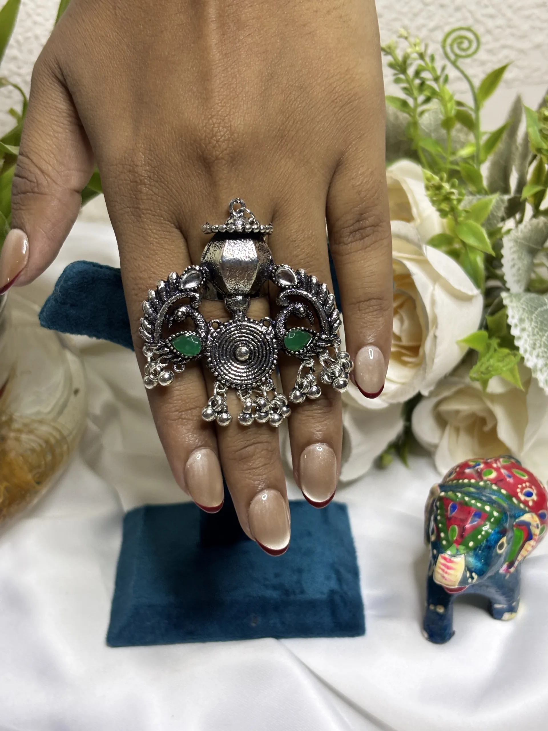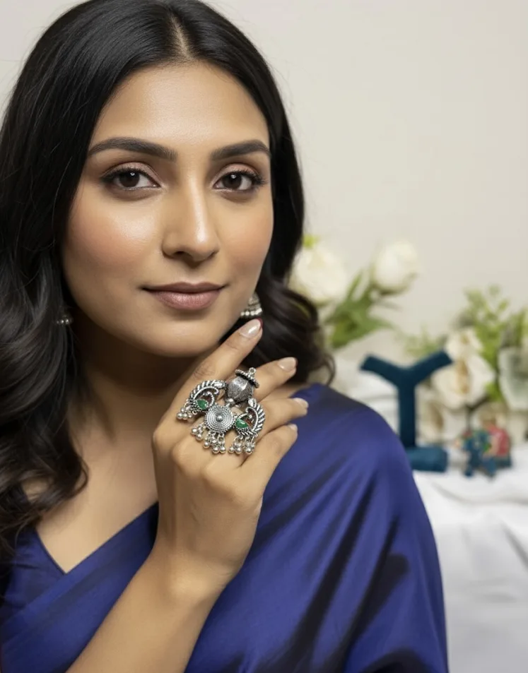 A trendy oxidized ring with intricate design, perfect to match with ethnic and western outfits.