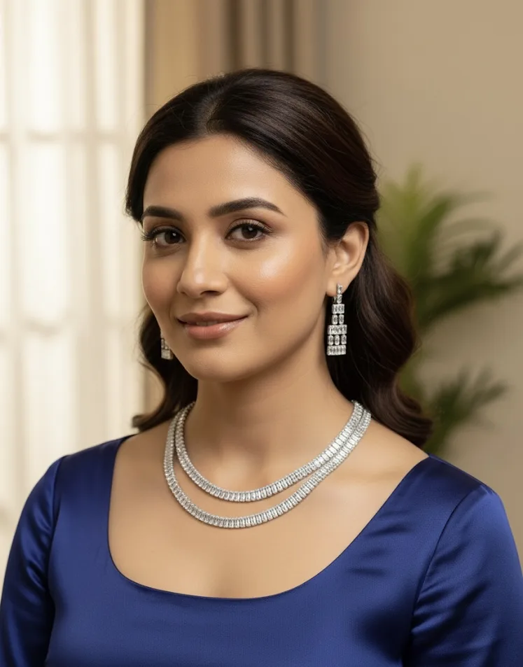 Modern slimline choker with stylish long earrings. Minimal yet luxurious.
